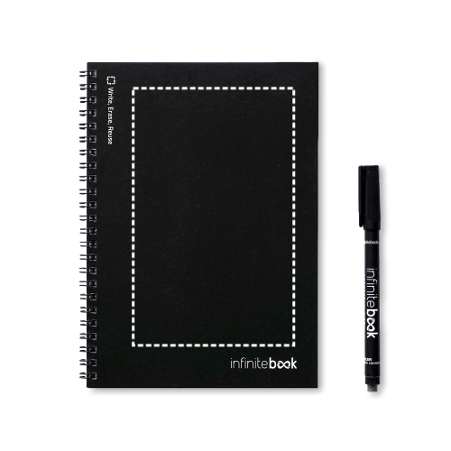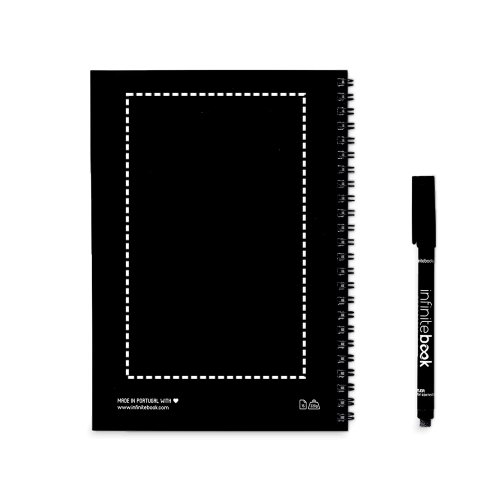 A5 Notizbuch - „Infinitebook“ - mit flexiblem Einband und farblich passenden Ringen. Enthält 15 unlinierte Seiten im Whiteboard-Stil und einen schwarzen Marker. Dieser Notizblock ermöglicht einfaches Schreiben und Radieren und ist eine praktische Lösung, um den Papierverbrauch zu minimieren. Notizen können gescannt werden. Hergestellt in Europa. Wird in einem Umschlag aus Kraftpapier mit einem Aufkleber geliefert. 148 x 210 mm