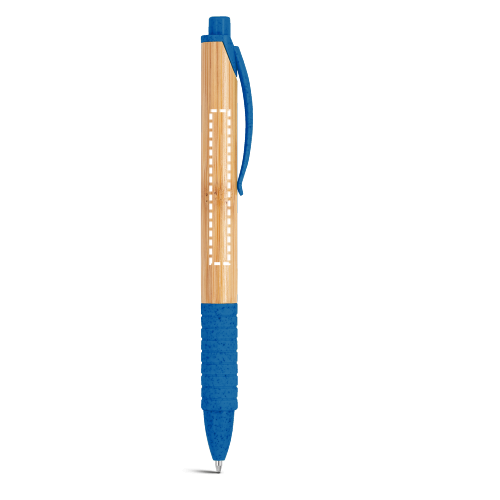 Kugelschreiber aus Bambus mit blauschreibender Mine. Der Clip und Gummigriff sind aus Weizenstrohfaser und ABS. Da das Produkt aus natürlichen Materialien hergestellt wird, können Farbe des Produkts sowie das Druckergebnis von Produkt zu Produkt unterschiedlich sein. ø11 x 142 mm